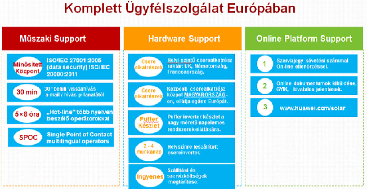Hazánk kedvező helyzetben van, hiszen itt található a Huawei napelemes üzletágának központi, európai logisztikai központja, amely teljes Európát kiszolgálja. A hazai logisztikai központban mind a cserealkatrészek, mind pedig az inverterek fellelhetők.