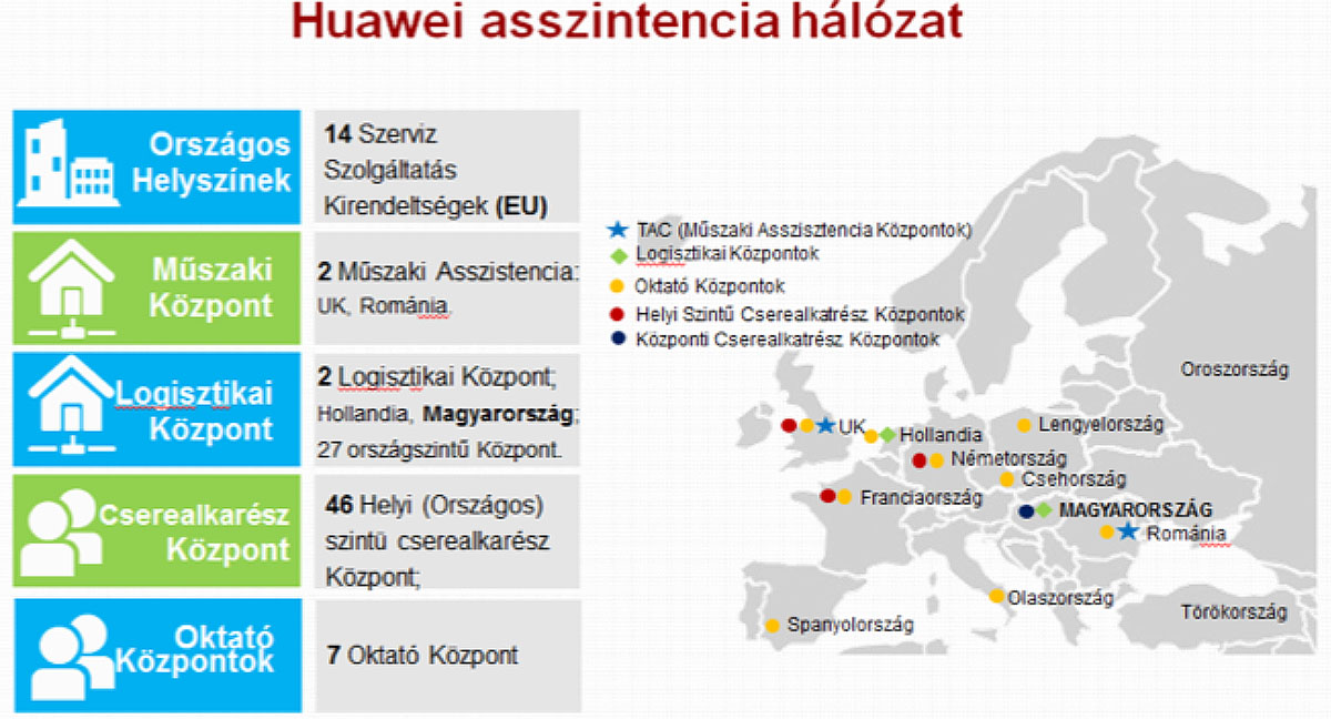 A Huawei teljes Európát lefedő hálózattal rendelkezik, amely érinti a kutatást, fejlesztést, oktatást, garanciális kérdéseket, asszisztenciát.