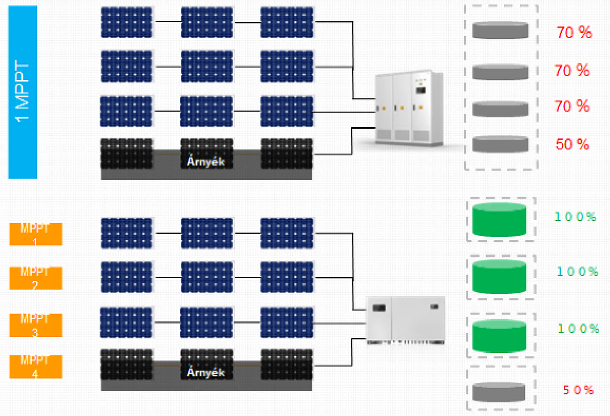 Beárnyékolás esetén csupán az érintett munkapontos várható kisebb hozam, míg a többi munkapont 100%-on tud dolgozni.