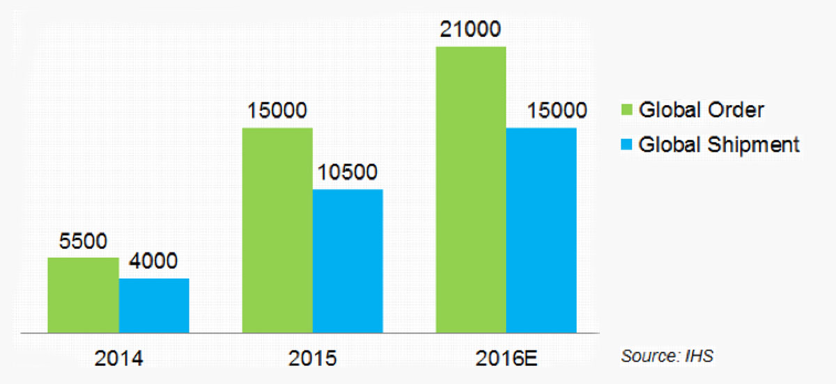 Az éves lekötött kapacitás folyamatosan nő, 2016. évre a becsült volumen várhatóan elérni 2.1 GW lekötött, és 1.5 GW leszállított mennyiséget.